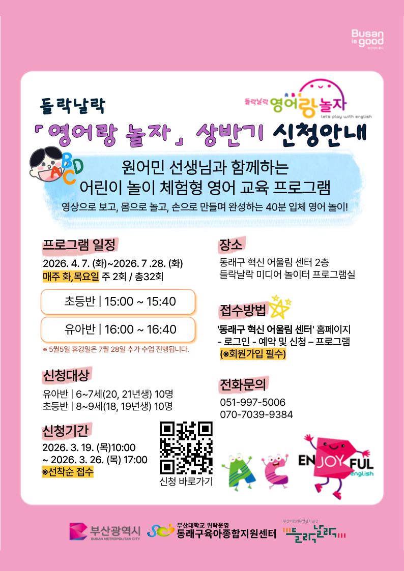 <µé¶ô³¯¶ô ¿µ¾î¶û ³îÀÚ »ó¹Ý±â ½Åû ¾È³»> ¡Û ½Åû±â°£ : 2026. 3.19.(¸ñ) 10:00 ~ 2026. 3.26.(¸ñ) 17:00 ¡Ø ¼±Âø¼ø ¸¶°¨ ¡Û ½Åû´ë»ó : 6~7¼¼(20, 21³â»ý) 10¸í / 8~9¼¼(18, 19³â»ý) 10¸í ¡Û ½Åû¹æ¹ý : ‘Çõ½Å¾î¿ï¸²¼¾ÅÍ È¨ÆäÀÌÁö’ – ·Î±×ÀÎ – ¿¹¾à ¹× ½Åû - ÇÁ·Î±×·¥ ¡Û ¹®ÀÇ : 070-7039-9384 / 051-997-5006