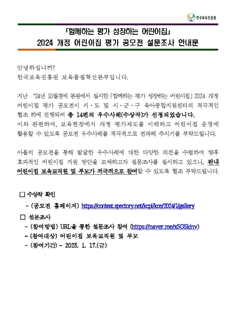 [Çѱ¹º¸À°ÁøÈï¿ø] 2024 °³Á¤ ¾î¸°ÀÌÁý Æò°¡ °ø¸ðÀü ¼³¹®Á¶»ç ¾È³»¹®