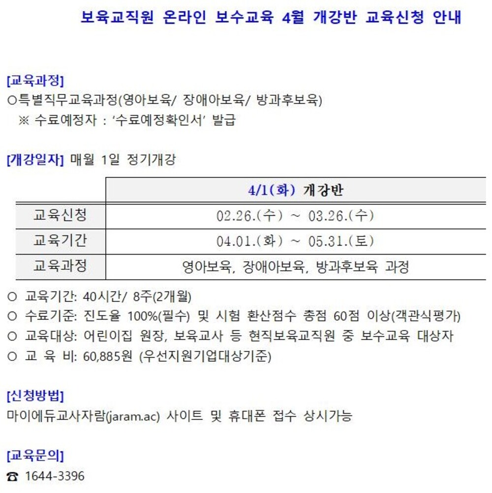 [¸¶ÀÌ¿¡µà±³»çÀÚ¶÷] º¸À°±³Á÷¿ø ¿Â¶óÀκ¸¼ö±³À° 4¿ù °³°¹Ý ±³À°½Åû ¾È³»