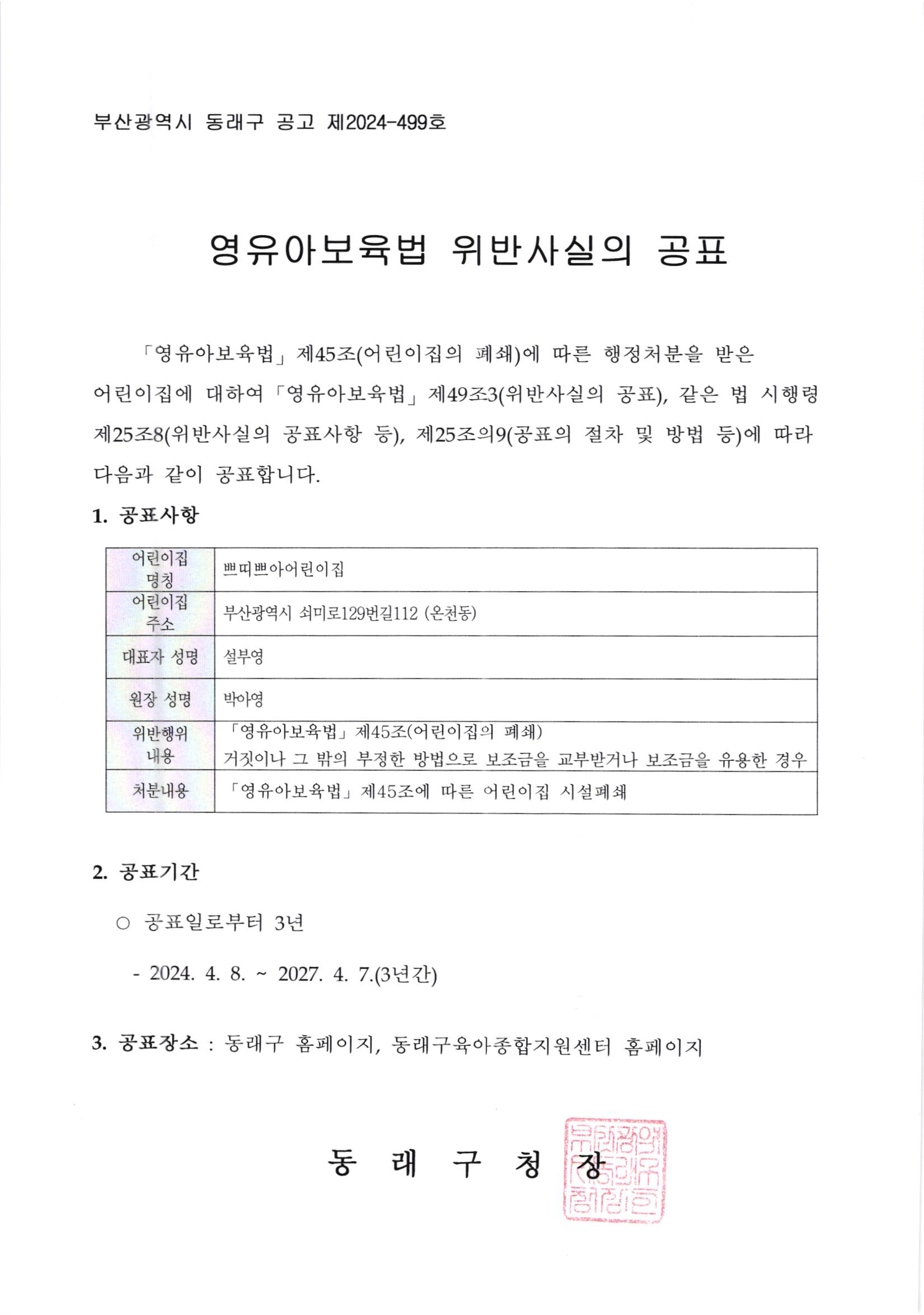 [µ¿·¡±¸Ã»] ¿µÀ¯¾Æº¸À°¹ý À§¹Ý¿¡ µû¸¥ °øÇ¥»çÇ× ¾È³»