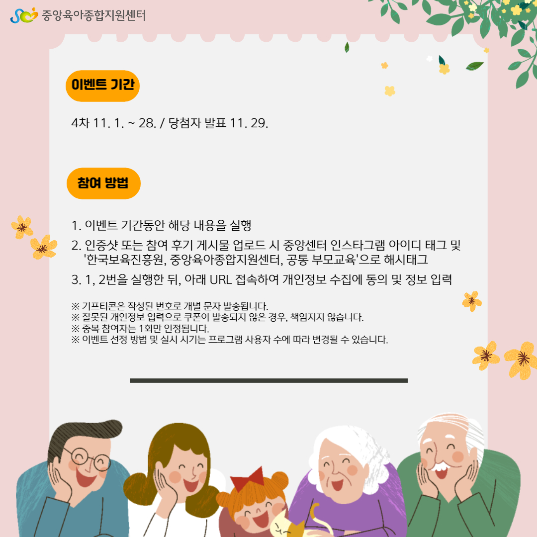 4Â÷ À̺¥Æ®´Â 11/1(È) ~ 11/28(¿ù)±îÁö ÇØ´ç ±â°£¿¡ °øÅë ºÎ¸ð±³À° ÀÎÁõ¼¦À» ¾÷·ÎµåÇÏ´Â ºÐµéÀ» ´ë»óÀ¸·Î ÁøÇàµÇ¸ç ÀÚ¼¼ÇÑ ³»¿ëÀº ºÙÀÓÀڷḦ Âü°íÇØ Áֽñ⠹ٶø´Ï´Ù.(ÀνºÅ¸±×·¥À¸·Î ÁøÇà) (4Â÷ À̺¥Æ® URL) https://forms.gle/CGviN3PZjkk1167a7