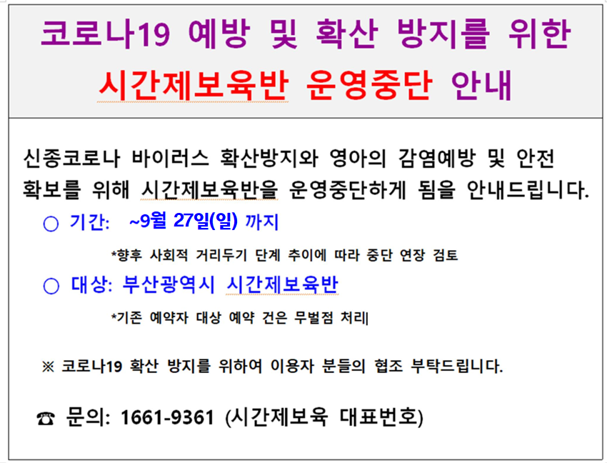 Äڷγª19 ¿¹¹æ ¹× È®»ê ¹æÁö¸¦ À§ÇÑ ½Ã°£Á¦º¸À°¹Ý ¿î¿µÁߴܱⰣ ¿¬Àå ¾È³»