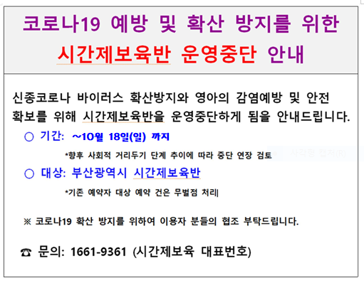 Äڷγª19 ¿¹¹æ ¹× È®»ê ¹æÁö¸¦ À§ÇÑ ½Ã°£Á¦º¸À°¹Ý ¿î¿µÁߴܱⰣ ¿¬Àå ¾È³»
