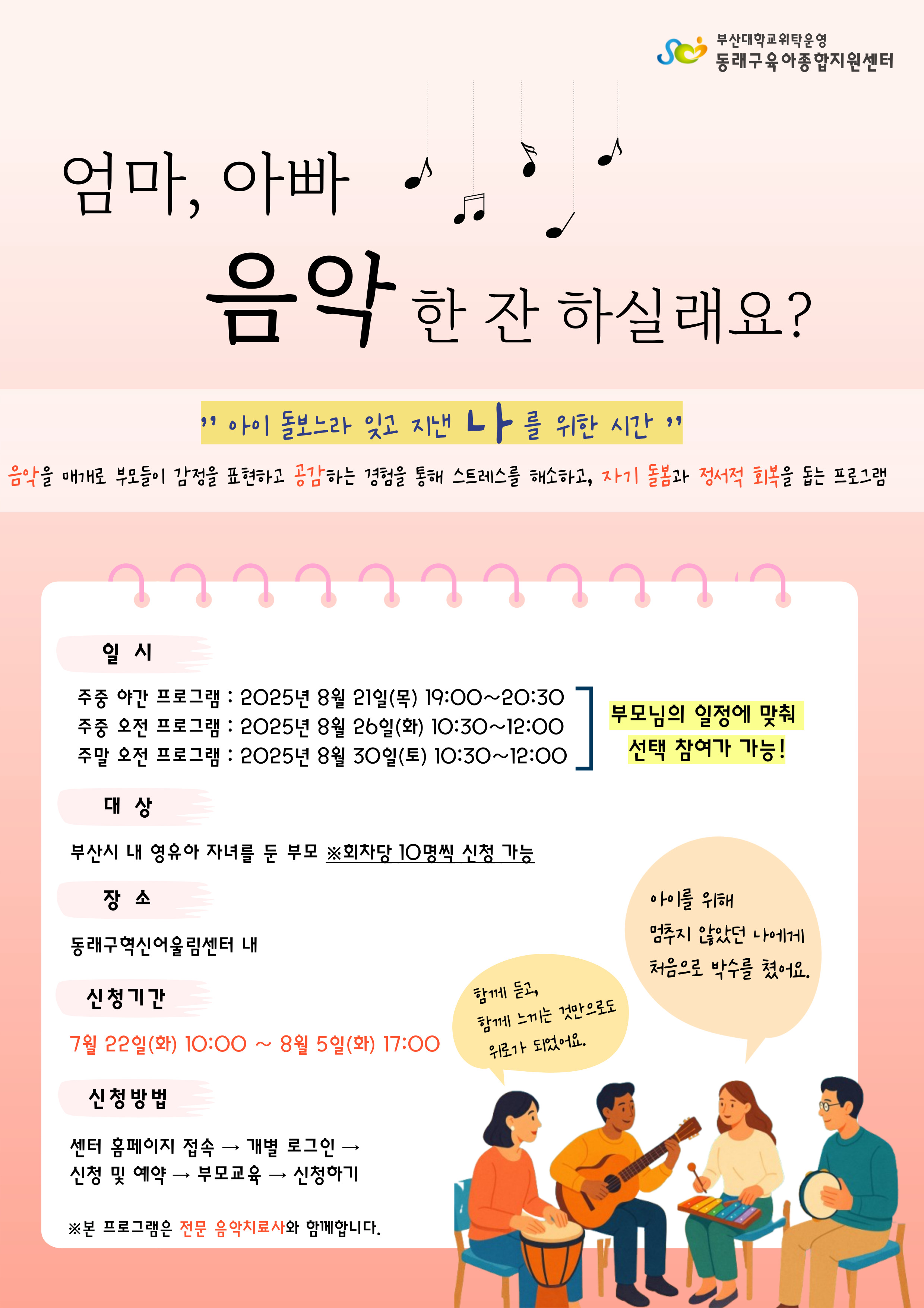 ¾ÆÀ̸¦ Ű¿ì´Â ÀÏ, °áÄÚ È¥ÀÚ °¨´çÇϱ⠽¬¿î ÀÏÀÌ ¾Æ´Õ´Ï´Ù. °¡²ûÀº ¸»·Î ´Ù Ç¥ÇöÇϱ⠾î·Á¿î ¸¶À½ÀÌ ÀÖÀ¸½Å°¡¿ä? À̹ø ÇÁ·Î±×·¥Àº À½¾ÇÀ» ¸Å°³·Î °¨Á¤À» ÀÚ¿¬½º·´°Ô Ç¥ÇöÇϰí, ½º½º·Î¸¦ ÀÌÇØÇÏ´Â ½Ã°£À» ÅëÇØ ¾çÀ°ÀÚÀÇ ½É¸®Àû ¾ÈÁ¤°ú ÀÚÁ¸°¨ ȸº¹À» µ½°íÀÚ ¸¶·ÃµÇ¾ú½À´Ï´Ù.