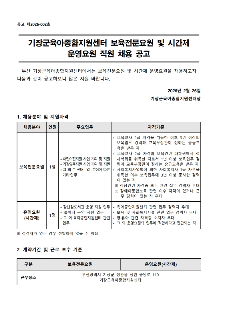 [ä¿ë°ø°í]±âÀ屺À°¾ÆÁ¾ÇÕÁö¿ø¼¾ÅÍ º¸À°Àü¹®¿ä¿ø ¹× ¿î¿µ¿ä¿ø(½Ã°£Á¦) ä¿ë °ø°í