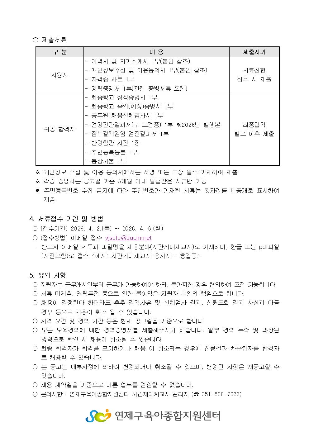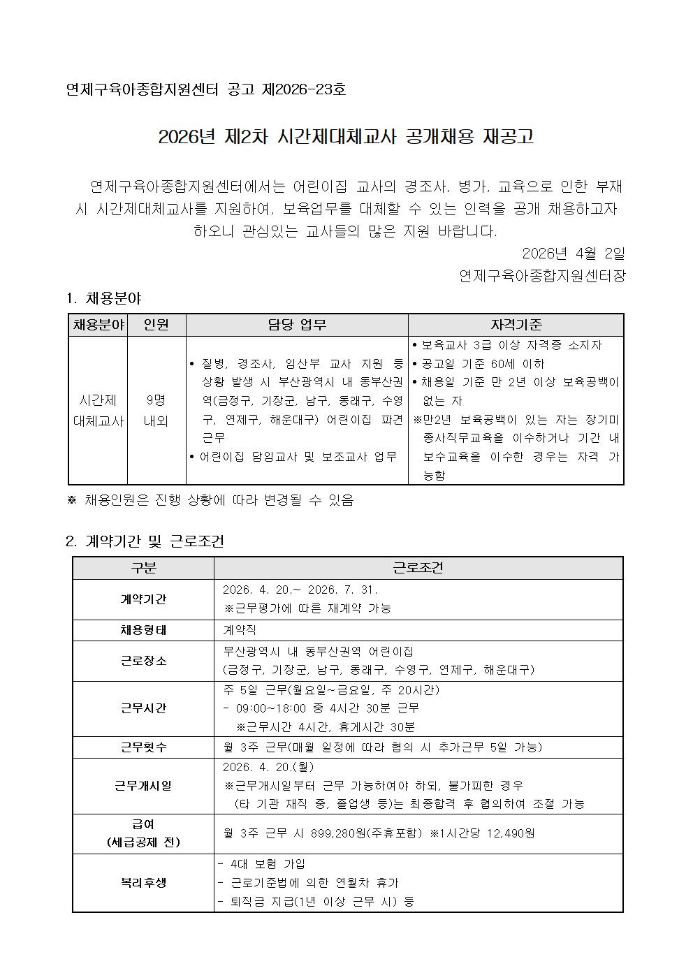 [ä¿ë°ø°í] ¿¬Á¦±¸À°¾ÆÁ¾ÇÕÁö¿ø¼¾ÅÍ 2026³â Á¦2Â÷ ½Ã°£Á¦´ëü±³»ç °ø°³Ã¤¿ë Àç°ø°í