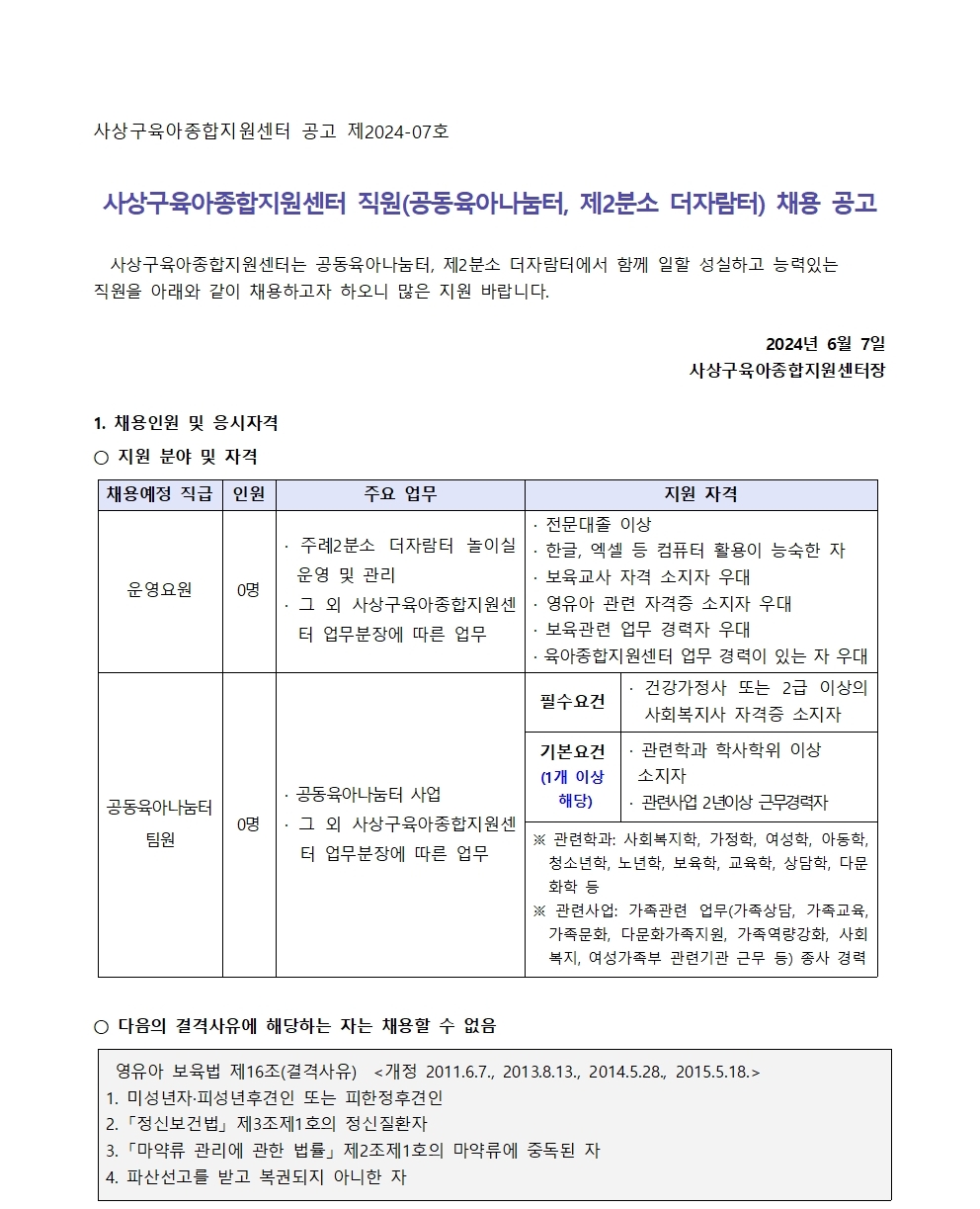 [ä¿ë°ø°í] »ç»ó±¸À°¾ÆÁ¾ÇÕÁö¿ø¼¾ÅÍ Á÷¿ø(°øµ¿À°¾Æ³ª´®ÅÍ, Á¦2ºÐ¼Ò ´õÀÚ¶÷ÅÍ) ä¿ë °ø°í