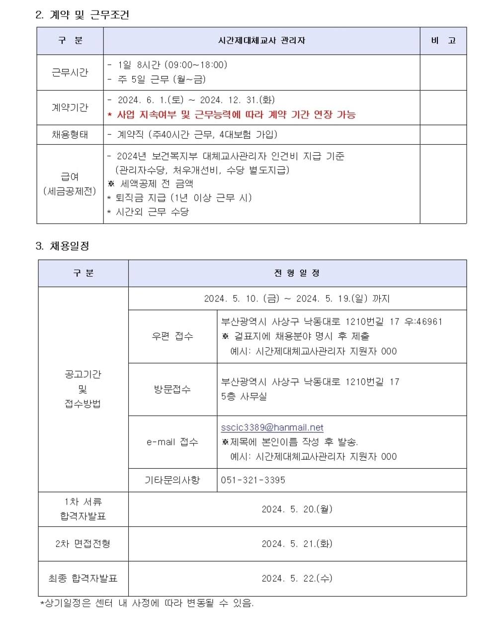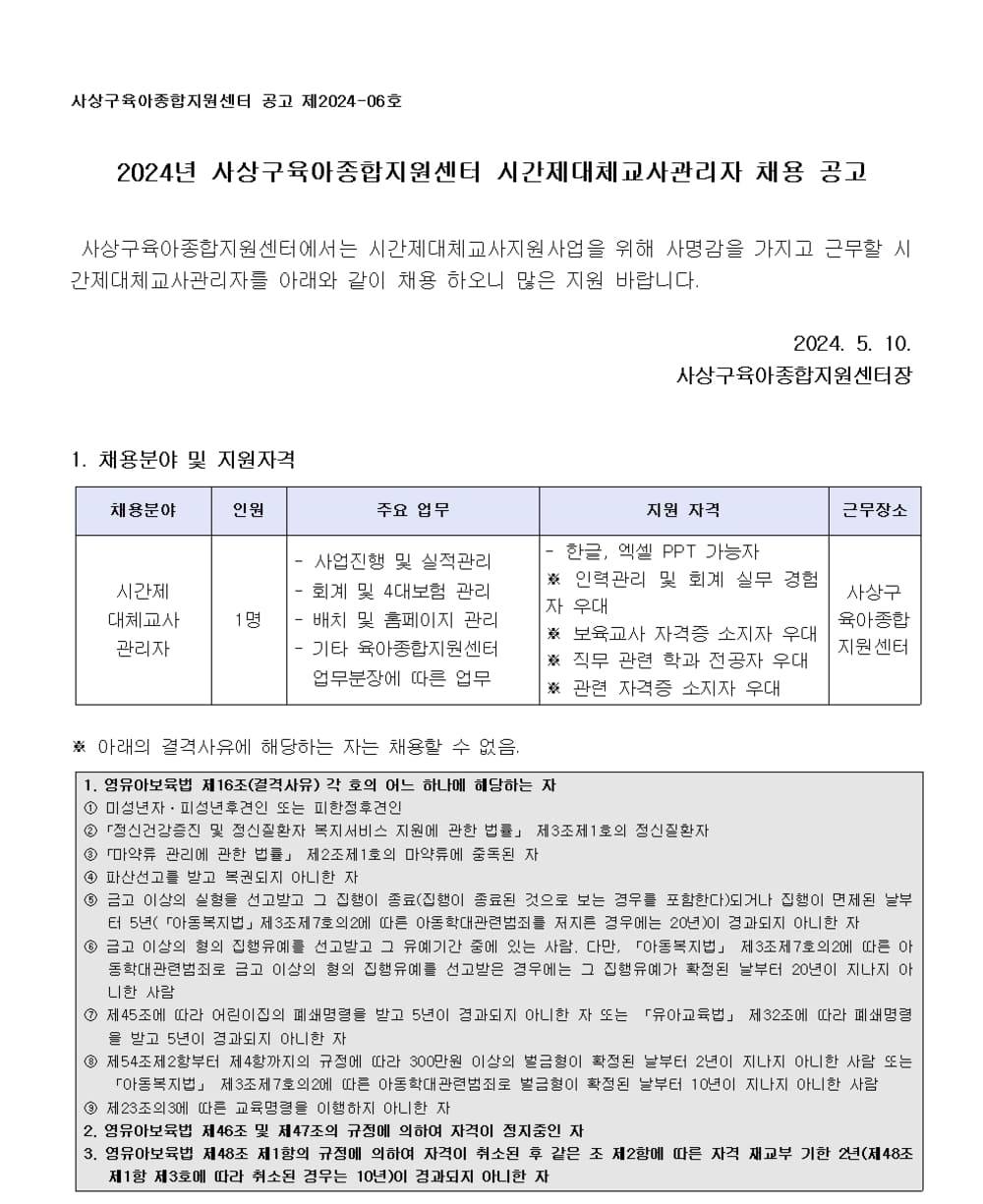 [ä¿ë°ø°í] 2024³â »ç»ó±¸À°¾ÆÁ¾ÇÕÁö¿ø¼¾ÅÍ ½Ã°£Á¦´ëü±³»ç°ü¸®ÀÚ Ã¤¿ë °ø°í