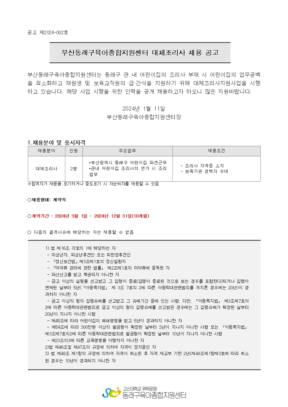 [ä¿ë°ø°í] µ¿·¡±¸À°¾ÆÁ¾ÇÕÁö¿ø¼¾ÅÍ ´ëüÁ¶¸®»ç ä¿ë °ø°í