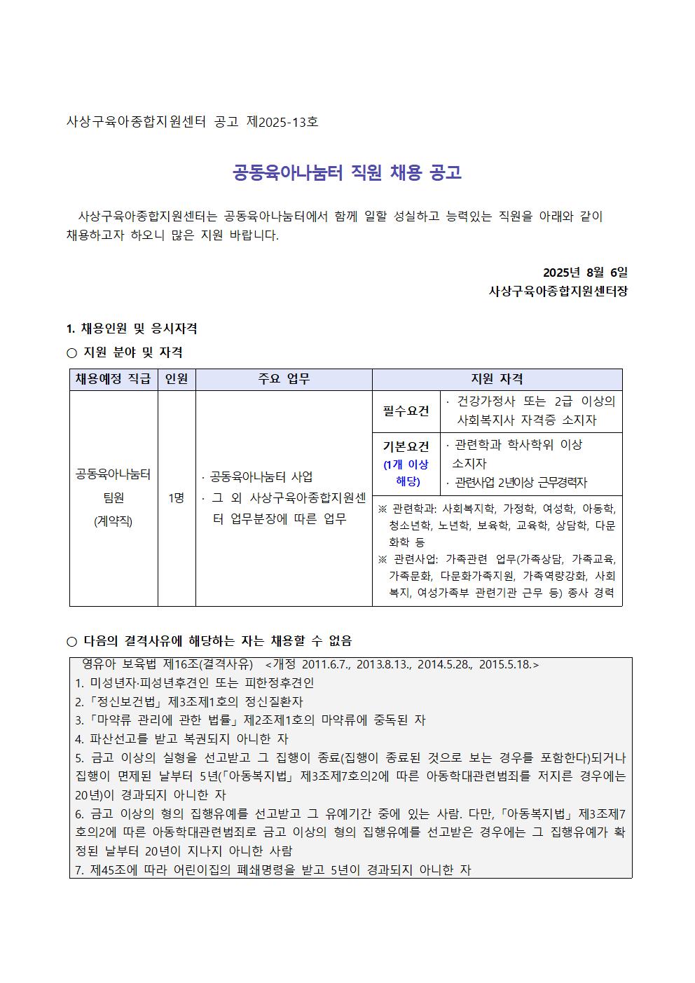[ä¿ë°ø°í] »ç»ó±¸À°¾ÆÁ¾ÇÕÁö¿ø¼¾ÅÍ °øµ¿À°¾Æ³ª´®ÅÍ Á÷¿ø ä¿ë °ø°í
