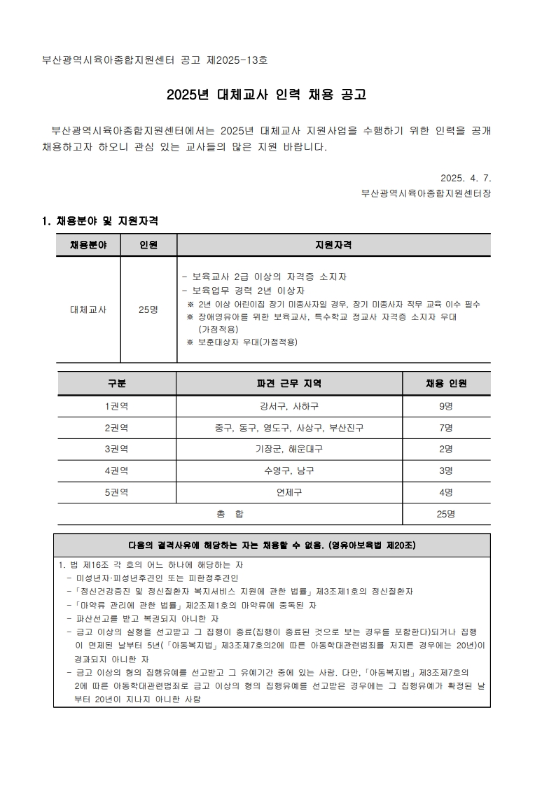 [ä¿ë°ø°í] 2025³â ºÎ»ê±¤¿ª½ÃÀ°¾ÆÁ¾ÇÕÁö¿ø¼¾ÅÍ ´ëü±³»ç Àη ä¿ë °ø°í