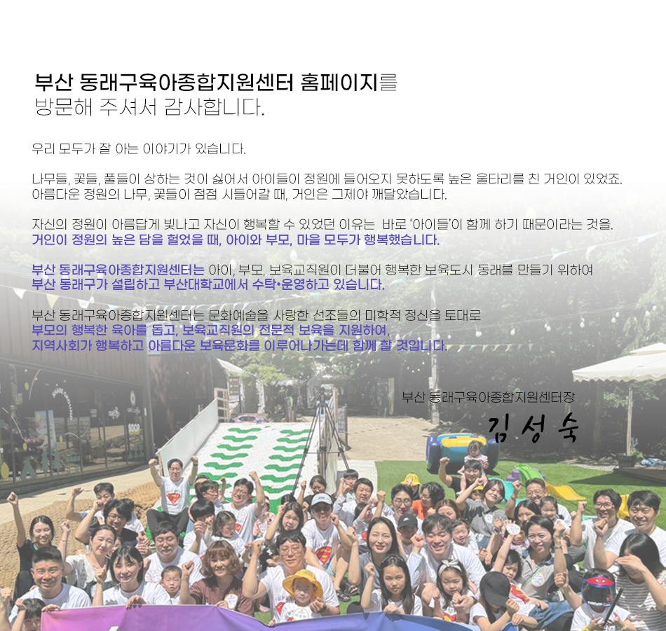 부산 동래구육아종합지원센터 홈페이지를 방문해 주셔서 감사드립니다.