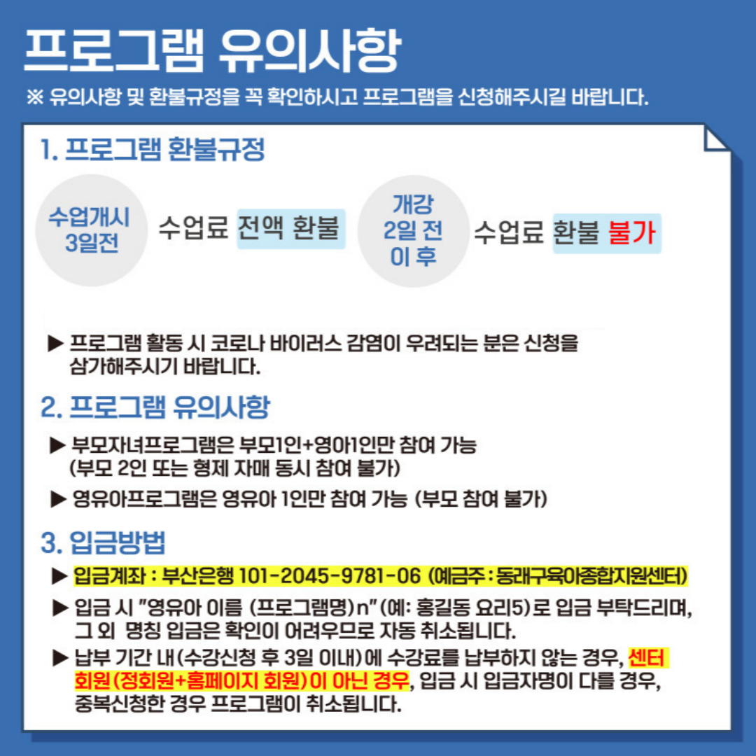 | ±âŸ»çÇ× | ⦁ÀԱݹæ¹ý -ÀԱݰèÁ : ºÎ»êÀºÇà 101-2045-9781-06(¿¹±ÝÁÖ: µ¿·¡±¸À°¾ÆÁ¾ÇÕÁö¿ø¼¾ÅÍ) -ÀÔ±Ý ½Ã "ÀÚ³à¸í/¹ß·¹8"(¿¹: È«±æµ¿ ¹ß·¹8)·Î ÀÔ±Ý ºÎʵ叮¸ç, ±× ¿ÜÀÇ ¸íĪ ÀÔ±ÝÀº È®ÀÎÀÌ ¾î·Á¿ì¹Ç·Î ÀÚµ¿ Ãë¼Ò µË´Ï´Ù. ⦁½Åû ½Ã À¯ÀÇ»çÇ× -ÇÁ·Î±×·¥ ÀϽà ¹× ´ë»óÀ» ²À È®ÀÎÇØÁֽñ⠹ٶø´Ï´Ù. -½Åû ÈÄ ½Åû³»¿ªÀ» ²À È®ÀÎÇÏ¿© ´ë±âÀÚÀÎ °æ¿ì¿¡´Â ÀÔ±ÝÇÏÁö ¸¶½Ã°í ¼ö° °¡´ÉÇÒ °æ¿ì ¼¾ÅÍ¿¡¼ µû·Î ¿¬¶ôÀ» µå¸³´Ï´Ù. - ´ë¸®Ãâ¼®À̳ª ¾çµµ´Â ºÒ°¡ÇÕ´Ï´Ù. - ¼ö¾÷ Àü ÈÄ Àμֽà ¾ÈÀü»ç°í´Â ºÎ¸ð´Ô²²ÀÖÀ¸´Ï ¾ÈÀü»ç°í¿¡ À¯ÀÇÇϽñ⠹ٶø´Ï´Ù. ⦁¼ö¾÷ ½Ã -¸Å ¼ö¾÷ ½Ã ¼¾ÅÍ È¸¿øÄ«µå¸¦ ¼ÒÁöÇØ Áֽñ⠹ٶø´Ï´Ù. -¼ö¾÷½ÃÀÛ ÈÄ ÀÔ½ÇÀÌ ¾î·Á¿ì´Ï ¼ö¾÷ ½ÃÀÛ 5ºÐÀü±îÁö ²À ÀÔ½ÇÇØ Áֽñ⠹ٶø´Ï´Ù. ⦁ȯºÒ¾È³» - ¹Ýȯ»çÀ¯¹ß»ýÀÏÀÌ °³°ÀÏ 3ÀÏÀüÀÏ °æ¿ì: ³³ºÎÇÑ ¼ö°·á Àü¾× ¹Ýȯ / °³°2ÀÏÀüÀÌÈÄ: ¹ÝȯºÒ°¡ - ȯºÒ±ÔÁ¤ È®ÀÎ ÈÄ ½ÅÁßÈ÷ ÇÁ·Î±×·¥À» ½ÅÃ»ÇØ ÁÖ½Ã±æ ¹Ù¶ø´Ï´Ù. ÀÎÅͳݻóÀ¸·Î Ãë¼Ò¸¦ ¿äûÇϽаæ¿ì µ¿·¡±¸À°¾ÆÁ¾ÇÕÁö¿ø¼¾ÅÍ·Î ÇÊÈ÷ ÀüÈÁÖ¼¼¿ä ⦁»óȲ¿¡ µû¶ó ÇÁ·Î±×·¥ ÀÏÁ¤ ¹× ³»¿ëÀÌ º¯°æµÉ ¼ö ÀÖ½À´Ï´Ù. |