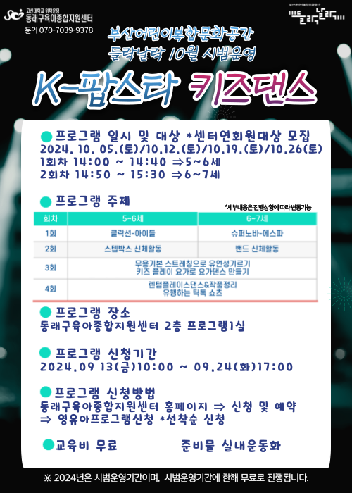 | ±³À°±â°£ | 2024-10-05(Åä) 14½Ã50ºÐ ~ 2024-10-26(Åä) 15½Ã30ºÐ | ||