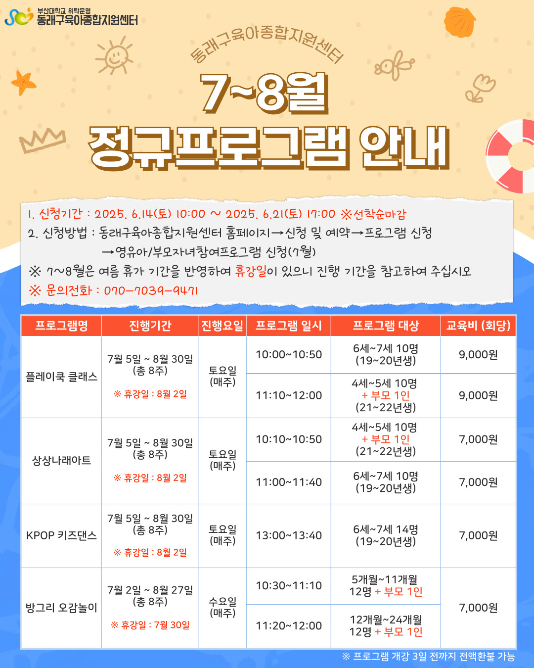 - °³°ÀÏ 3ÀÏ Àü : ³³ºÎÇÑ ¼ö°·á Àü¾× ȯºÒ °³°ÀÏ 2ÀÏ Àü ÀÌÈÄ : Àü¾× ¹× ºÎºÐ ȯºÒ ºÒ°¡ - ȯºÒ±ÔÁ¤ È®ÀÎ ÈÄ ½ÅÁßÈ÷ ÇÁ·Î±×·¥À» ½ÅÃ»ÇØ ÁÖ½Ã±æ ¹Ù¶ø´Ï´Ù. ÀÎÅͳÝÀ¸·Î Ãë¼ÒÇϽаæ¿ì, µ¿·¡±¸À°¾ÆÁ¾ÇÕÁö¿ø¼¾ÅÍ·Î ÇÊÈ÷ ÀüÈÁÖ¼¼¿ä ⦁ »óȲ¿¡ µû¶ó ÇÁ·Î±×·¥ ÀÏÁ¤ ¹× ³»¿ëÀÌ º¯°æµÉ ¼ö ÀÖ½À´Ï´Ù