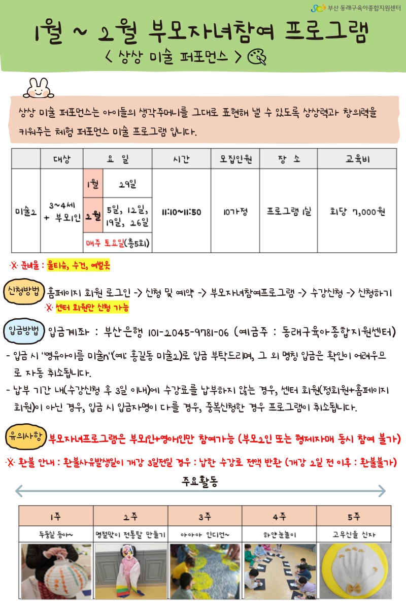 | ±âŸ»çÇ× | ⦁ÀԱݹæ¹ý -ÀԱݰèÁ : ºÎ»êÀºÇà 101-2045-9781-06(¿¹±ÝÁÖ: µ¿·¡±¸À°¾ÆÁ¾ÇÕÁö¿ø¼¾ÅÍ) -ÀÔ±Ý ½Ã "ÀÚ³à¸í/¾Ç±ân"(¿¹: È«±æµ¿ ¹Ì¼ú1)·Î ÀÔ±Ý ºÎʵ叮¸ç, ±× ¿ÜÀÇ ¸íĪ ÀÔ±ÝÀº È®ÀÎÀÌ ¾î·Á¿ì¹Ç·Î ÀÚµ¿ Ãë¼Ò µË´Ï´Ù. ⦁½Åû ½Ã À¯ÀÇ»çÇ× -ÇÁ·Î±×·¥ ÀϽà ¹× ´ë»óÀ» ²À È®ÀÎÇØÁֽñ⠹ٶø´Ï´Ù. -½Åû ÈÄ ½Åû³»¿ªÀ» ²À È®ÀÎÇÏ¿© ´ë±âÀÚÀÎ °æ¿ì¿¡´Â ÀÔ±ÝÇÏÁö ¸¶½Ã°í ¼ö° °¡´ÉÇÒ °æ¿ì ¼¾ÅÍ¿¡¼ µû·Î ¿¬¶ôÀ» µå¸³´Ï´Ù. - ´ë¸®Ãâ¼®À̳ª ¾çµµ´Â ºÒ°¡ÇÕ´Ï´Ù. - ¼ö¾÷ Àü ÈÄ Àμֽà ¾ÈÀü»ç°í´Â ºÎ¸ð´Ô²²ÀÖÀ¸´Ï ¾ÈÀü»ç°í¿¡ À¯ÀÇÇϽñ⠹ٶø´Ï´Ù. -ÀÚ³à ¿¬·ÉÀº ÇÁ·Î±×·¥ ÀϽà ±âÁØÀ¸·Î ¸ÂÃß¾î ½ÅûÇÕ´Ï´Ù. ´Ü, 1¿ù~2¿ùÀÇ °æ¿ì ¾î¸°ÀÌÁý ÇÐ±Þ ¿¬·É±âÁØ¿¡ µû¸¨´Ï´Ù. (¿µ¾ÆÀÇ °æ¿ì °³¿ù ¼ö¿¡ µû¶ó º¯µ¿ µÊ) ¿¹) 2017³â 5¼¼ À¯¾Æ°¡ 2022³â 2¿ù±îÁö´Â 5¼¼¹ÝÀ̹ǷΠ5¼¼ ÇÁ·Î±×·¥À» ½ÅûÇÕ´Ï´Ù. ⦁¼ö¾÷ ½Ã -¸Å ¼ö¾÷ ½Ã ¼¾ÅÍ È¸¿øÄ«µå¸¦ ¼ÒÁöÇØ Áֽñ⠹ٶø´Ï´Ù. -¼ö¾÷½ÃÀÛ ÈÄ ÀÔ½ÇÀÌ ¾î·Á¿ì´Ï ¼ö¾÷ ½ÃÀÛ 5ºÐÀü±îÁö ²À ÀÔ½ÇÇØ Áֽñ⠹ٶø´Ï´Ù. ⦁ȯºÒ¾È³» - ¹Ýȯ»çÀ¯¹ß»ýÀÏÀÌ °³°ÀÏ 3ÀÏÀüÀÏ °æ¿ì: ³³ºÎÇÑ ¼ö°·á Àü¾× ¹Ýȯ / °³°2ÀÏÀüÀÌÈÄ: ¹ÝȯºÒ°¡ - ȯºÒ±ÔÁ¤ È®ÀÎ ÈÄ ½ÅÁßÈ÷ ÇÁ·Î±×·¥À» ½ÅÃ»ÇØ ÁÖ½Ã±æ ¹Ù¶ø´Ï´Ù. ÀÎÅͳݻóÀ¸·Î Ãë¼Ò¸¦ ¿äûÇϽаæ¿ì µ¿·¡±¸À°¾ÆÁ¾ÇÕÁö¿ø¼¾ÅÍ·Î ÇÊÈ÷ ÀüÈÁÖ¼¼¿ä |