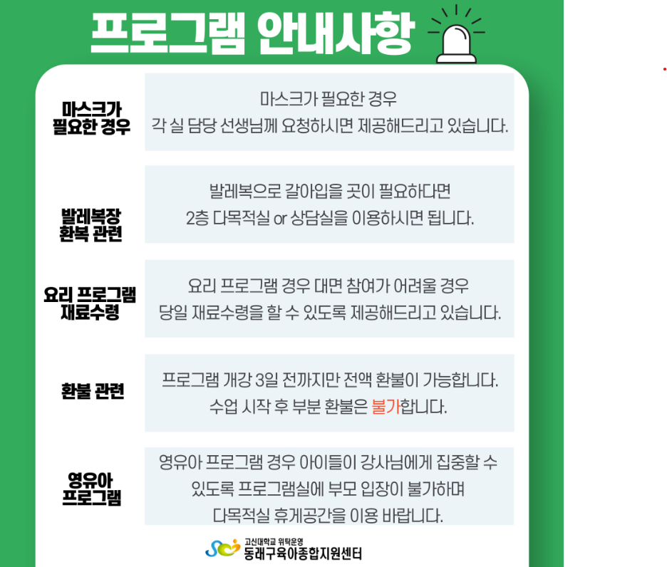 | ±âŸ»çÇ× | ÀԱݹæ¹ý -ÀԱݰèÁ : ºÎ»êÀºÇà 101-2045-9781-06(¿¹±ÝÁÖ: µ¿·¡±¸À°¾ÆÁ¾ÇÕÁö¿ø¼¾ÅÍ) -ÀÔ±Ý ½Ã "ÀÚ³à¸í/¹æ±×¸®3¡°(¿¹: È«±æµ¿ ¹æ±×¸®3)·Î ÀÔ±Ý ºÎʵ叮¸ç, ±× ¿ÜÀÇ ¸íĪ ÀÔ±ÝÀº È®ÀÎÀÌ ¾î·Á¿ì¹Ç·Î ÀÚµ¿ Ãë¼Ò µË´Ï´Ù. ⦁½Åû ½Ã À¯ÀÇ»çÇ× -ÇÁ·Î±×·¥ ÀϽà ¹× ´ë»óÀ» ²À È®ÀÎÇØÁֽñ⠹ٶø´Ï´Ù. -½Åû ÈÄ ½Åû³»¿ªÀ» ²À È®ÀÎÇÏ¿© ´ë±âÀÚÀÎ °æ¿ì¿¡´Â ÀÔ±ÝÇÏÁö ¸¶½Ã°í ¼ö° °¡´ÉÇÒ °æ¿ì ¼¾ÅÍ¿¡¼ µû·Î ¿¬¶ôÀ» µå¸³´Ï´Ù. - ´ë¸®Ãâ¼®À̳ª ¾çµµ´Â ºÒ°¡ÇÕ´Ï´Ù. - ¼ö¾÷ Àü ÈÄ Àμֽà ¾ÈÀü»ç°í´Â ºÎ¸ð´Ô²²ÀÖÀ¸´Ï ¾ÈÀü»ç°í¿¡ À¯ÀÇÇϽñ⠹ٶø´Ï´Ù. ⦁¼ö¾÷ ½Ã -¸Å ¼ö¾÷ ½Ã ¼¾ÅÍ È¸¿øÄ«µå¸¦ ¼ÒÁöÇØ Áֽñ⠹ٶø´Ï´Ù. -¼ö¾÷½ÃÀÛ ÈÄ ÀÔ½ÇÀÌ ¾î·Á¿ì´Ï ¼ö¾÷ ½ÃÀÛ 5ºÐÀü±îÁö ²À ÀÔ½ÇÇØ Áֽñ⠹ٶø´Ï´Ù. ⦁ȯºÒ¾È³» - ¹Ýȯ»çÀ¯¹ß»ýÀÏÀÌ °³°ÀÏ 3ÀÏÀüÀÏ °æ¿ì: ³³ºÎÇÑ ¼ö°·á Àü¾× ¹Ýȯ / °³°2ÀÏÀüÀÌÈÄ: ¹ÝȯºÒ°¡ - ȯºÒ±ÔÁ¤ È®ÀÎ ÈÄ ½ÅÁßÈ÷ ÇÁ·Î±×·¥À» ½ÅÃ»ÇØ ÁÖ½Ã±æ ¹Ù¶ø´Ï´Ù. ÀÎÅͳݻóÀ¸·Î Ãë¼Ò¸¦ ¿äûÇϽаæ¿ì µ¿·¡±¸À°¾ÆÁ¾ÇÕÁö¿ø¼¾ÅÍ·Î ÇÊÈ÷ ÀüÈÁÖ¼¼¿ä ⦁»óȲ¿¡ µû¶ó ÇÁ·Î±×·¥ ÀÏÁ¤ ¹× ³»¿ëÀÌ º¯°æµÉ ¼ö ÀÖ½À´Ï´Ù. |