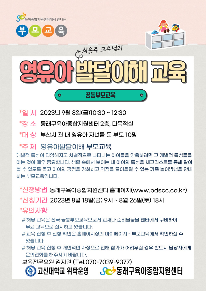 | ±âŸ»çÇ× | ¡Ø ÇØ´ç ±³À°Àº ¡¸ºÎ¸ð¡¹ ´ë»óÀÇ ±³À°À¸·Î¼, Àڳฦ µ¿¹ÝÇÑ ÀÔ½ÇÀÌ ºÒ°¡ÇÔÀ» ¾È³»µå¸³´Ï´Ù. ¡Ø ÇØ´ç ±³À°ÀÇ ½ÅûÀÚ¿¡°Ô´Â ¡¸ºÎ¸ð±³À° ±³À硹°¡ ¹«·á·Î Á¦°øµË´Ï´Ù. |