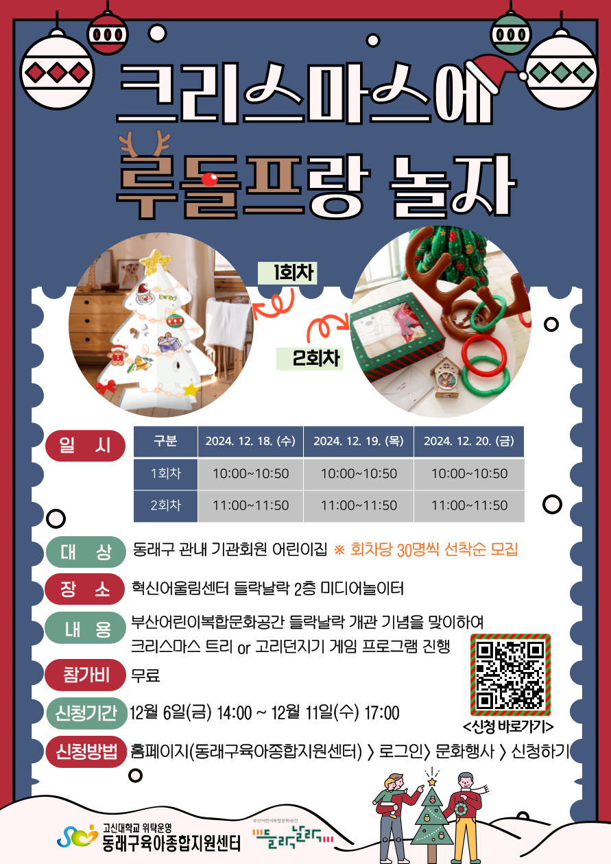 | (12/18)¾î¸°À̺¹ÇÕ¹®È°ø°£ µé¶ô³¯¶ô ¹Ìµð¾î³îÀÌÅÍ °³°ü±â³ä Çà»ç - Å©¸®½º¸¶½ºÆ®¸® ¸¸µé±â (1ȸÂ÷) 10:00~10:50 | |||