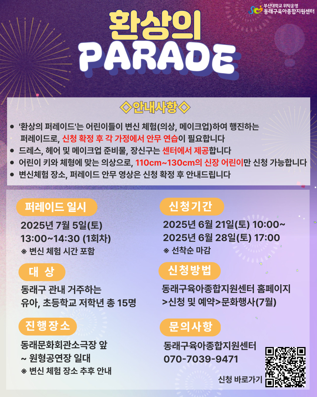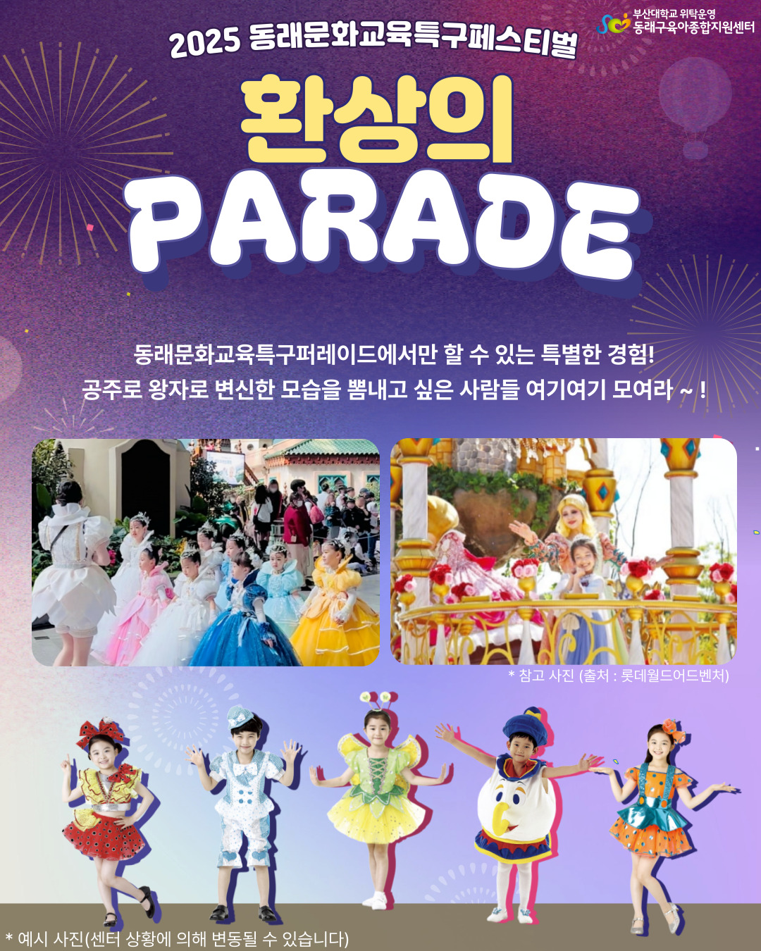 | ±âŸ»çÇ× | - ȯ»óÀÇ ÆÛ·¹À̵å´Â ¾î¸°À̵éÀÌ º¯½Å üÇè(ÀÇ»ó, ¸ÞÀÌÅ©¾÷)ÇÏ¿© ÇàÁøÇÏ´Â ÆÛ·¹À̵å·Î, ½Åû È®Á¤ ÈÄ °¢ °¡Á¤¿¡¼ ¾È¹« ¿¬½ÀÀÌ ÇÊ¿äÇÕ´Ï´Ù. - µå·¹½º, Çì¾î ¹× ¸ÞÀÌÅ©¾÷ Áغñ¹° Àå½Å±¸´Â ¼¾ÅÍ¿¡¼ Á¦°øÇÕ´Ï´Ù. - ¾î¸°ÀÌ Å°¿Í üÇü¿¡ ¸Â´Â ÀÇ»óÀ¸·Î, 110cm~130cmÀÇ ½ÅÀå ¾î¸°À̸¸ ½Åû °¡´ÉÇÕ´Ï´Ù. - º¯½ÅüÇè Àå¼Ò, ÆÛ·¹ÀÌµå ¾È¹« ¿µ»óÀº ½Åû È®Á¤ ÈÄ ¾È³»µå¸³´Ï´Ù. * ½Åû È®Á¤ ÀÌÈÄ º¯½ÅüÇè Àå¼Ò ¹× ÆÛ·¹ÀÌµå ¾È¹«¿µ»ó, ÆÛ·¹À̵å ÁøÇà µî ±¸Ã¼ÀûÀÎ ¾È³»°¡ ÀÌ·ç¾îÁú ¿¹Á¤ÀÔ´Ï´Ù. |