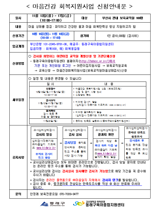 | ¸¶À½°Ç°È¸º¹Áö¿ø(º¸À°±³Á÷¿ø¸¶À½»óŰ˻ç) | |||