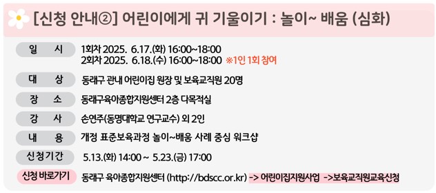 : Ÿ±¸¿¡ °ÅÁÖÇϰí ÀÖÀ¸³ª µ¿·¡±¸ °ü³» ¾î¸°ÀÌÁý¿¡ ±Ù¹«ÇÏ´Â °æ¿ì ¸¶ÀÌÆäÀÌÁö->³ªÀÇ È¸¿øÁ¤º¸ ¼öÁ¤¿¡¼ °ÅÁÖÁö¸¦ µ¿·¡±¸·Î º¯°æÇÏ¿© ½ÅûÇÏ½Ã¸é µË´Ï´Ù. 2. ±³À°Àå ÀÔÀå ½Ã ½ÅºÐÁõ È®ÀÎÀÌ ÁøÇàµÇ¿À´Ï ÁöÂüÇÏ¿© Áֽñ⠹ٶø´Ï´Ù. 3. ±³À° ½ÃÀÛ 10ºÐ ÀÌÈÄ ÀÔ½ÇÇÑ ÀÚ, Á¾·á Àü Åð½ÇÇÑ ÀÚ, ±³À° Áß ÀÚ¸®¸¦ 10ºÐÀÌ»ó ºñ¿î ÀÚ¿¡°Ô´Â ¼ö·áÁõ ¹ß±ÞÀÌ Á¦Çѵ˴ϴÙ. 4. ¼ö·áÁõÀº ±³À° ´çÀÏ ¹ß±ÞµË´Ï´Ù. ¡Ø¼±Âø¼øÀ¸·Î ¸¶°¨µÇ¿À´Ï ¸¹Àº °ü½É°ú Âü¿© ºÎʵ右´Ï´Ù. ¡Ø±³Àç°¡ ¹èºÎµÉ ¿¹Á¤ÀÔ´Ï´Ù.